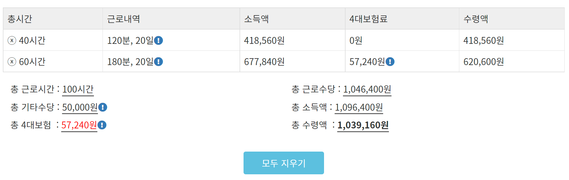 시급과 시급 외 수당에 대해서 요양보호사가 내는 4대 보험료를 계산해 준다.