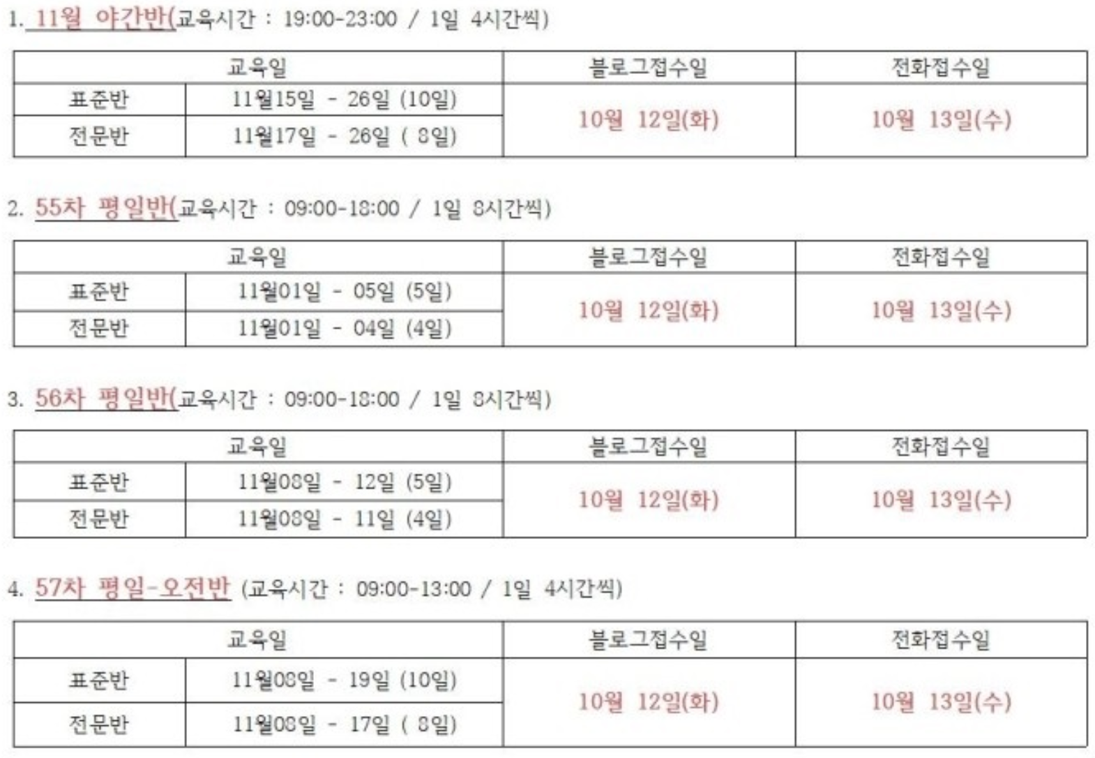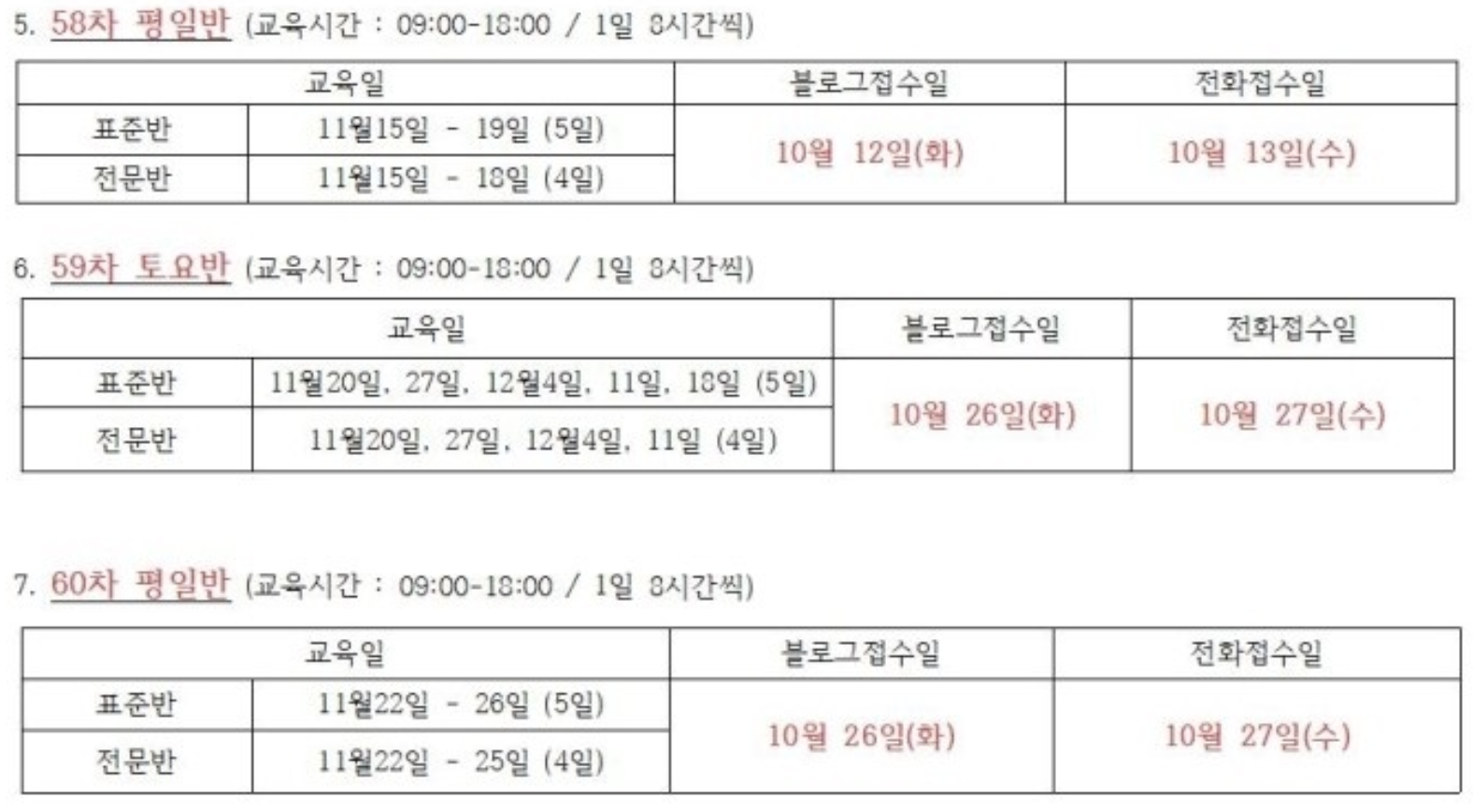 | 2021년 11월 | 표준과정(5일): 11/8(월)~11/12(금) 전문과정(4일) : 11/8(월)~11/11(목) *접수 10/27(수)10:00 선착순 50명/대기 20명으로 마감 |