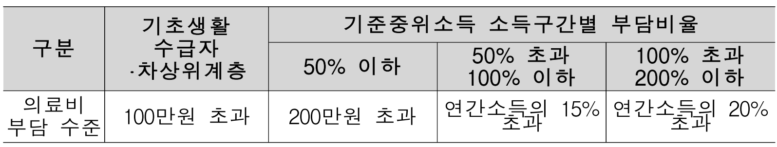 소득구간별 의료비 부담 수준 기준금액(부담비율)