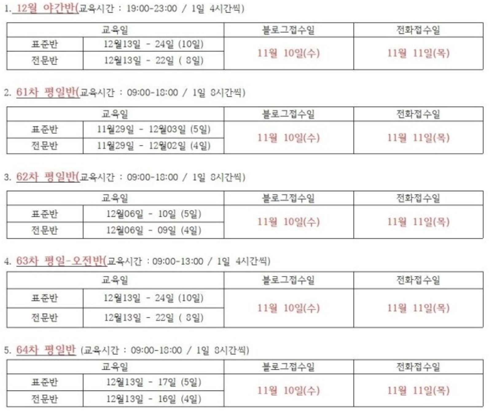 11월08일(월)~11월11일(목) | 월요일~목요일 08:50~17:50 (점심시간 1시간) 온라인교육과정으로 ZOOM을 활용한 실시간교육입니다. (코로나19 및 교육원 사정에 따라 일정이 변경되거나 대면교육 으로 전환될수 있음) *선착순 마감 및 상시접수 가능합니다. |