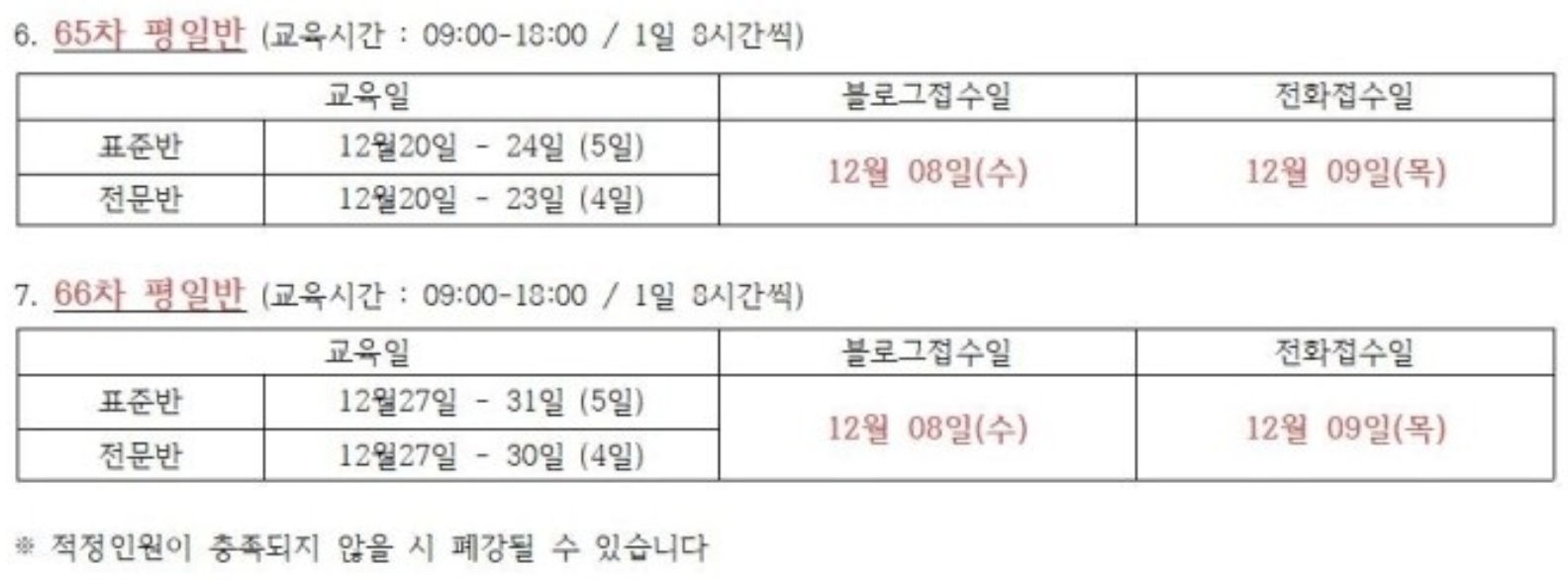 11월20일~12월18일 (총5일) ※토요일만 수업, 일요일은 수업 없음 |