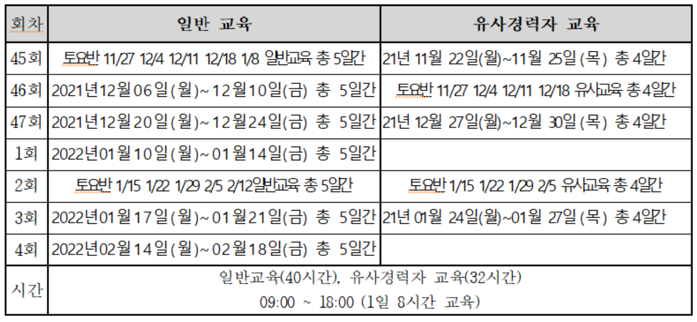 11월08일(월)~11월12일(금) | 월요일~금요일 09:00~18:00 (점심시간 1시간) * 온라인교육과정으로 ZOOM을 활용한 실시간교육입니다. (코로나19 및 교육원 사정에 따라 일정이 변경되거나 대면교육 으로 전환될수 있음) *선착순 마감 및 상시접수 가능합니다. |