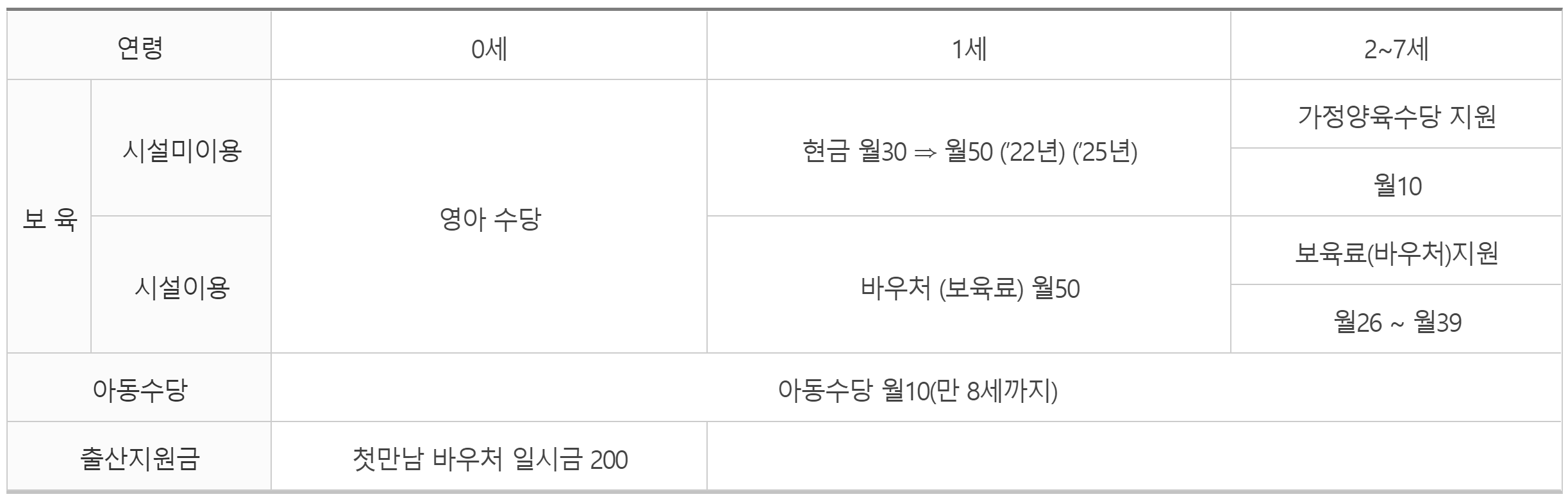 - 영아수당(현금)은 2025년 50만 원까지 단계적으로 확대될 예정으로, 2025년이 되면 어린이집 이용 시의 보육료와 가정양육 시의 영아수당(현금)이 50만 원으로 같아져 양육방식과 관계없이 동일한 지원을 받게 된다.