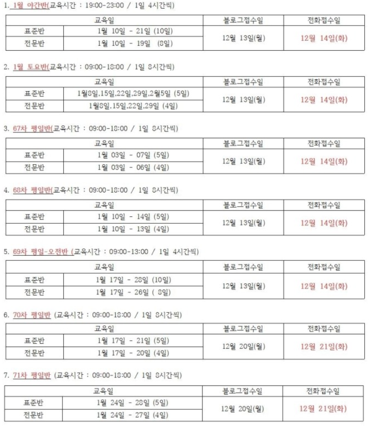 1월8일~2월5일 (총5일) ※토요일만 수업, 일요일은 수업 없음 |