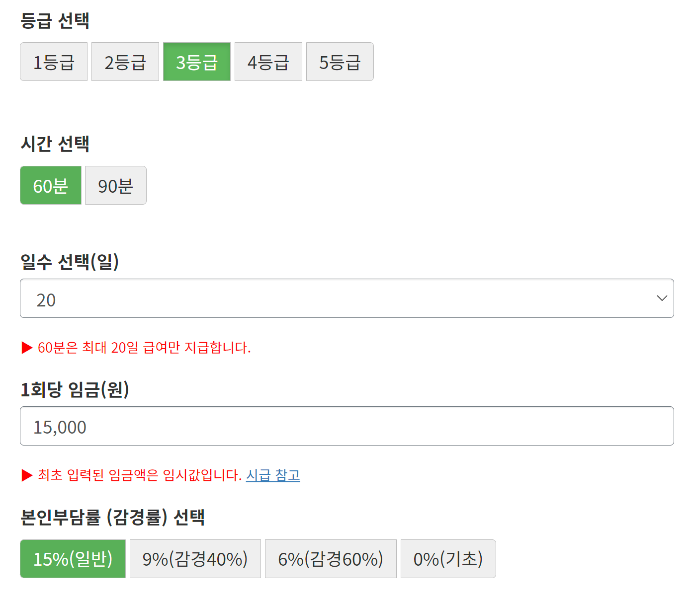 어르신의 등급만 선택하면 기본 입력값에 의해 자동으로 계산해 준다.
