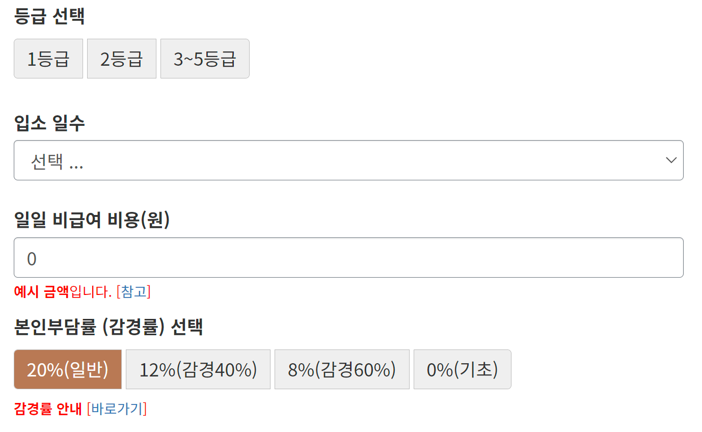 요양원 모의계산기를 등급만 선택하면 기본값들에 의해 즉시 이용요금을 계산해 준다.