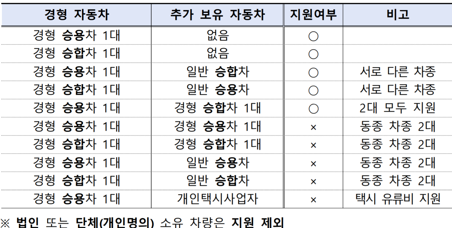 - 경형자동차 소유자와 주민등록표상 동거가족이 소유한 승용자동차 또는 승합자동차 각각의 합계가 1대인 경우