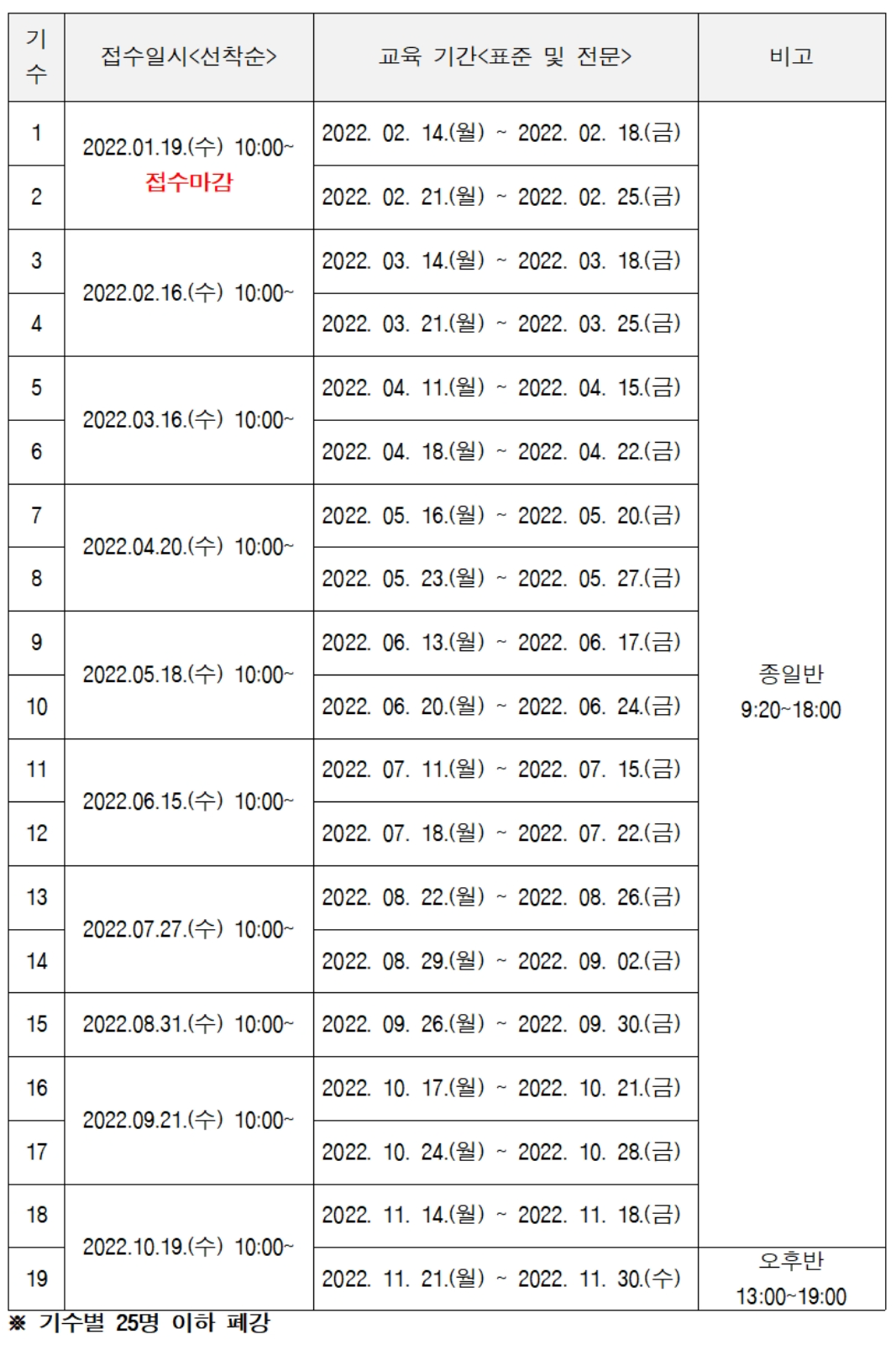 교육 접수는 선착순으로 진행하며 기수별로 25명 이하 일 경우 폐강된다.