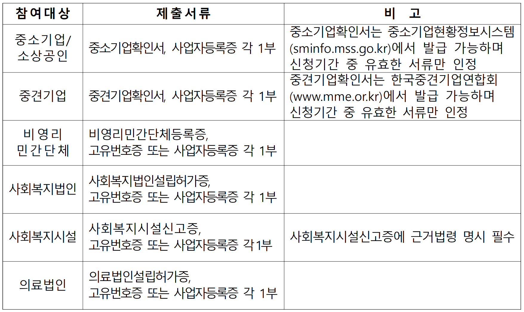 - 단, 법인이 아닌 중소기업, 비영리민간단체는 대표자만 참여 제외