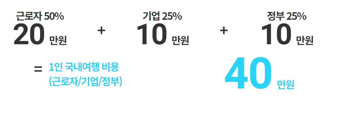 근로자의 고용형태 및 소득과 상관없이 근로자가 20만 원을 적립하면 정부에서 10만원, 기업에서 10만원을 추가로 적립해서 총 40만원의 국내 여행 경비를 지원해 준다.