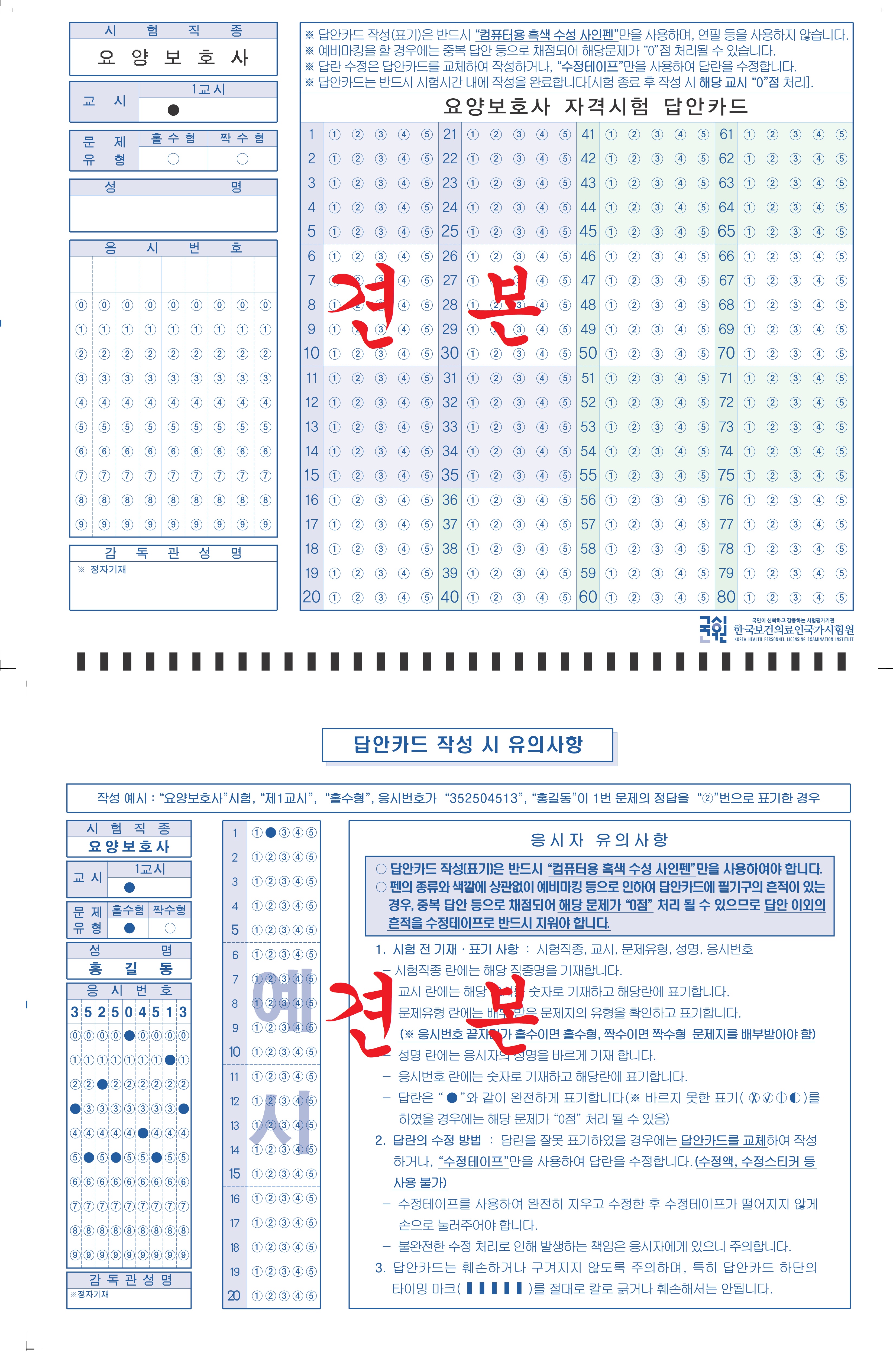 요양보호사 시험 시 사용하는 답안카드 견본입니다.