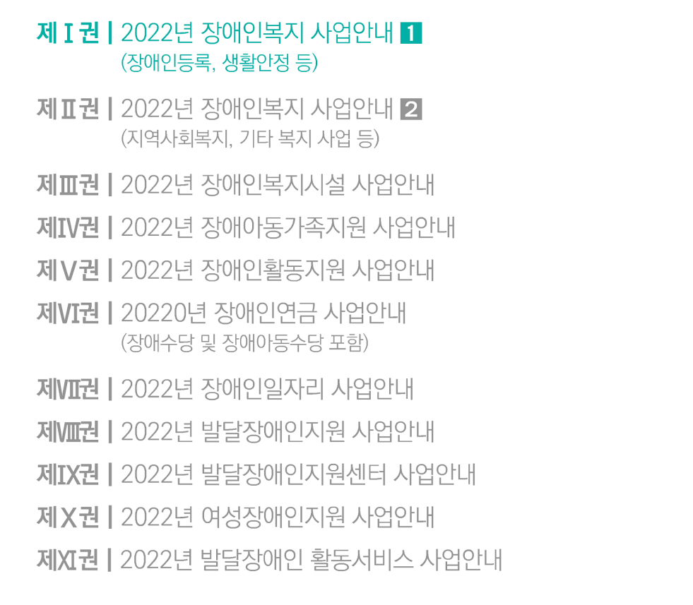 장애인 복지 관련 사업안내는 총 11권으로 구성되어 있다. 이 중 첫 번째에 해당하는 2022년 장애인복지 사업안내(1권)이다. 장애인 등록과 생활안정, 관련 서식 및 질의응답 등으로 이루어져 있다.