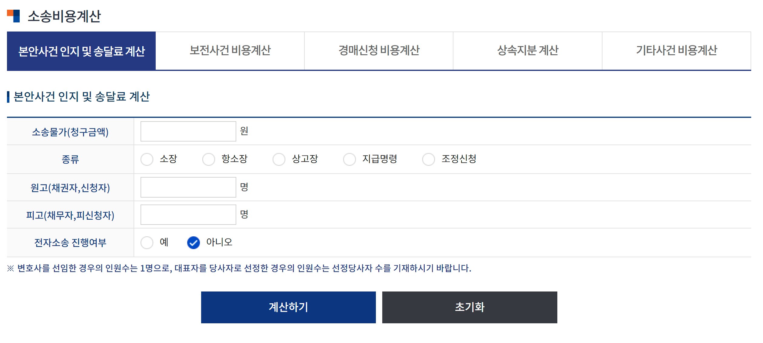 소송에 대해 본인이 부담해야 할 비용에 대해 모의 계산해 보는 프로그램이 제공하고 있다.