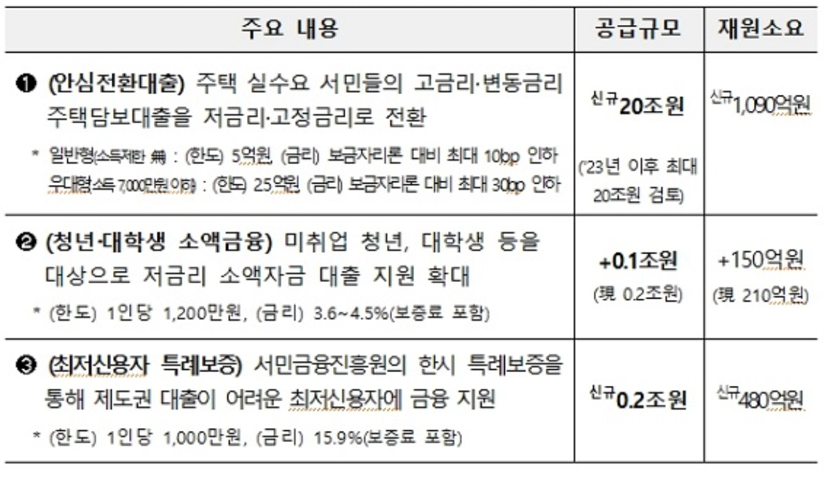 취약계층을 대상으로 저금리·고정금리로 전환, 쳥년·대학생 소액금융, 최저신용자 특례보증 지원의 20조원 규모의 금융지원 3종 패키지도 발표했다.