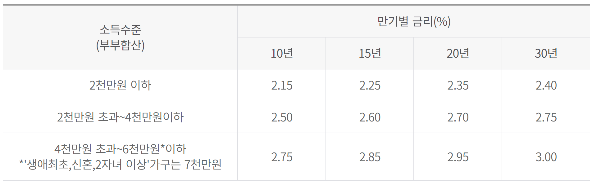 생애최초로 주택을 구입하는 신혼가구인 경우에는 아래 표의 금리 적용