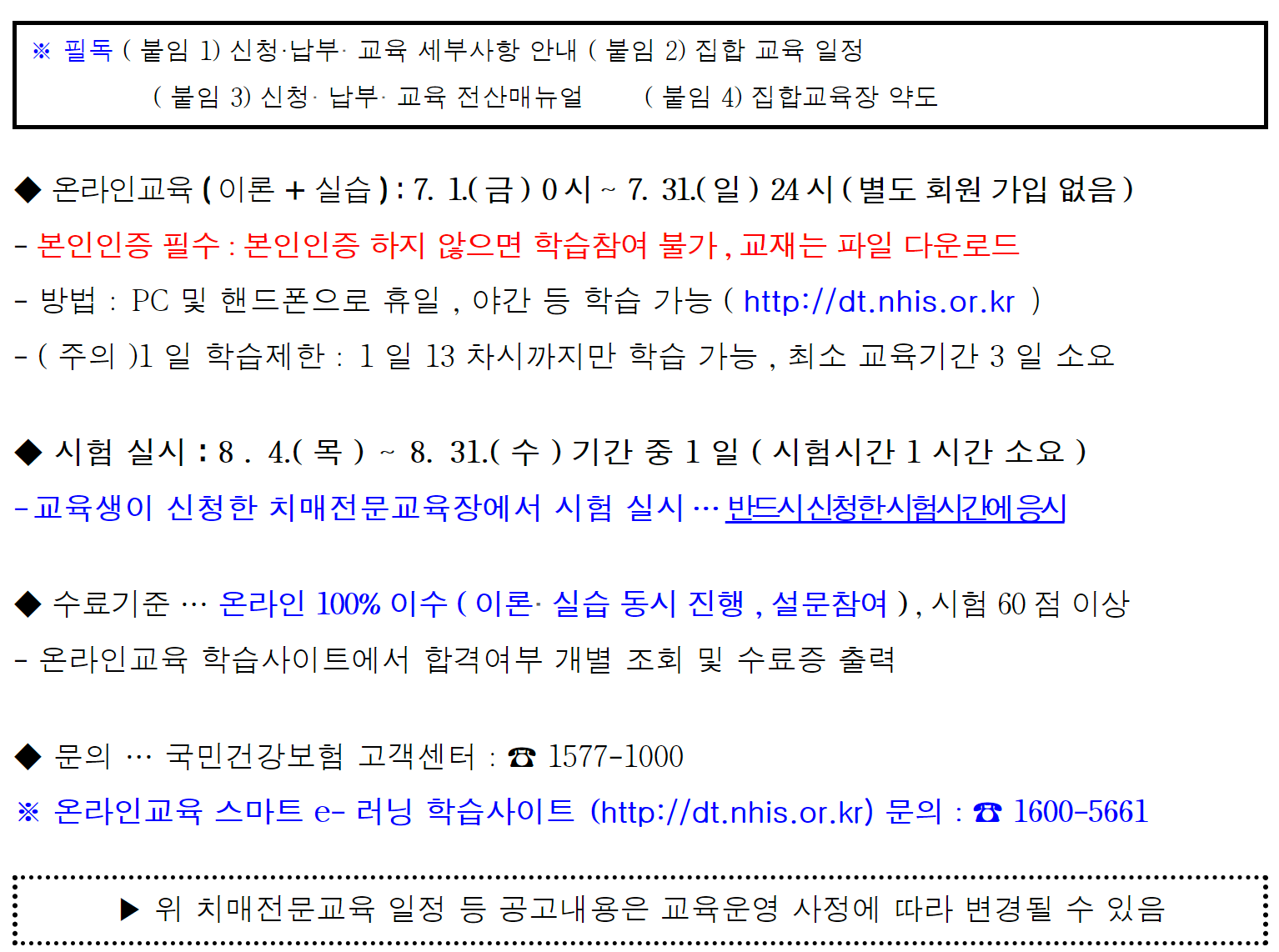 교육은 온라인 교육으로 진행하며, 시험은 집합하여 실시한다.
