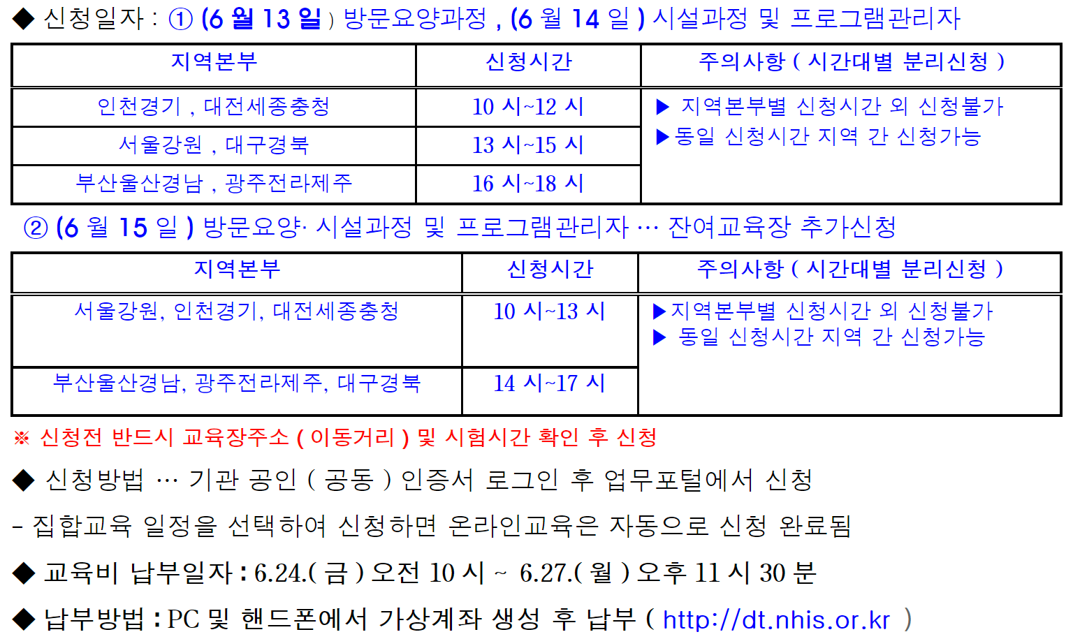 | 신청일자 | (6 월 13 일 ) 방문요양과정 (6 월 14 일 ) 시설과정 및 프로그램관리자 (6 월 15 일 ) 방문요양· 시설과정 및 프로그램관리자 … 잔여교육장 추가신청 |