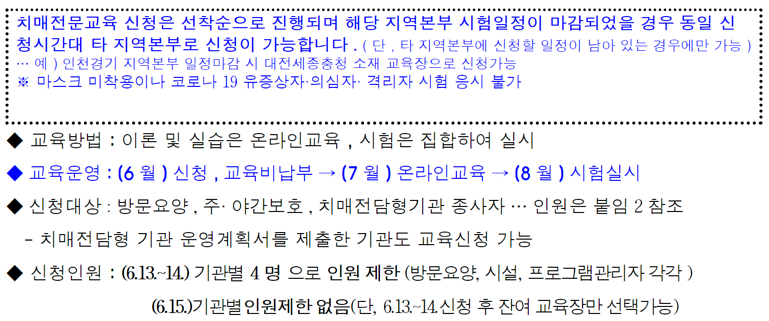 6월 치매전문교육 신청 일정 공고가 떴다. 올해 총 7차수의 치매전문교육 중 4차수 일정에 대한 신청 및 교육 일정에 대한 공고이다. 치매전문교육은 방문요양 , 주· 야간보호 , 치매전담형기관 종사자가 받을 수 있으며, 개인이 신청을 할 수는 없다.