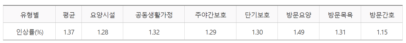 유형별 인상률로는 방문요양급여 1.49%, 노인요양시설 1.28%, 공동생활가정 1.32% 등 전체 평균 1.37% 인상될 예정이다.