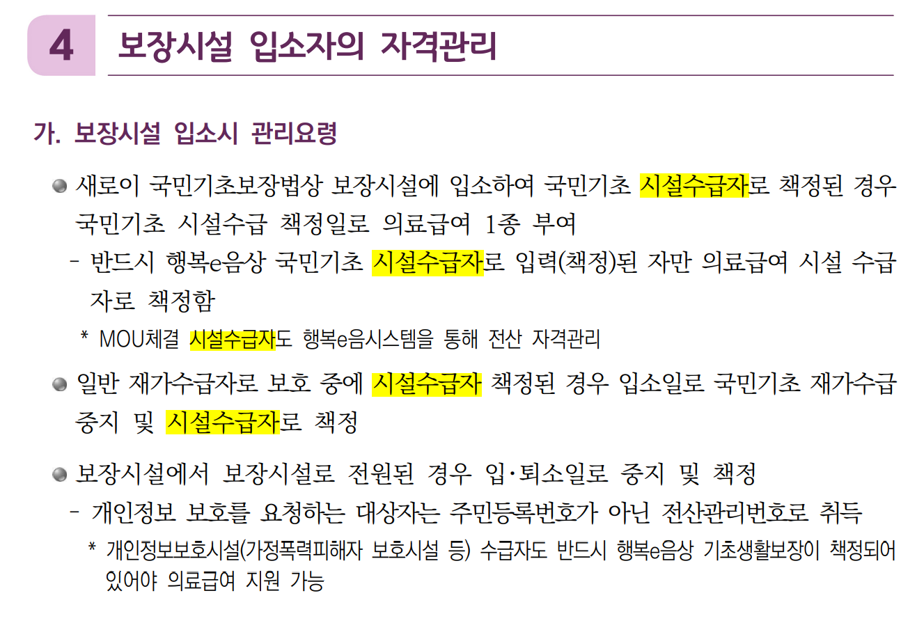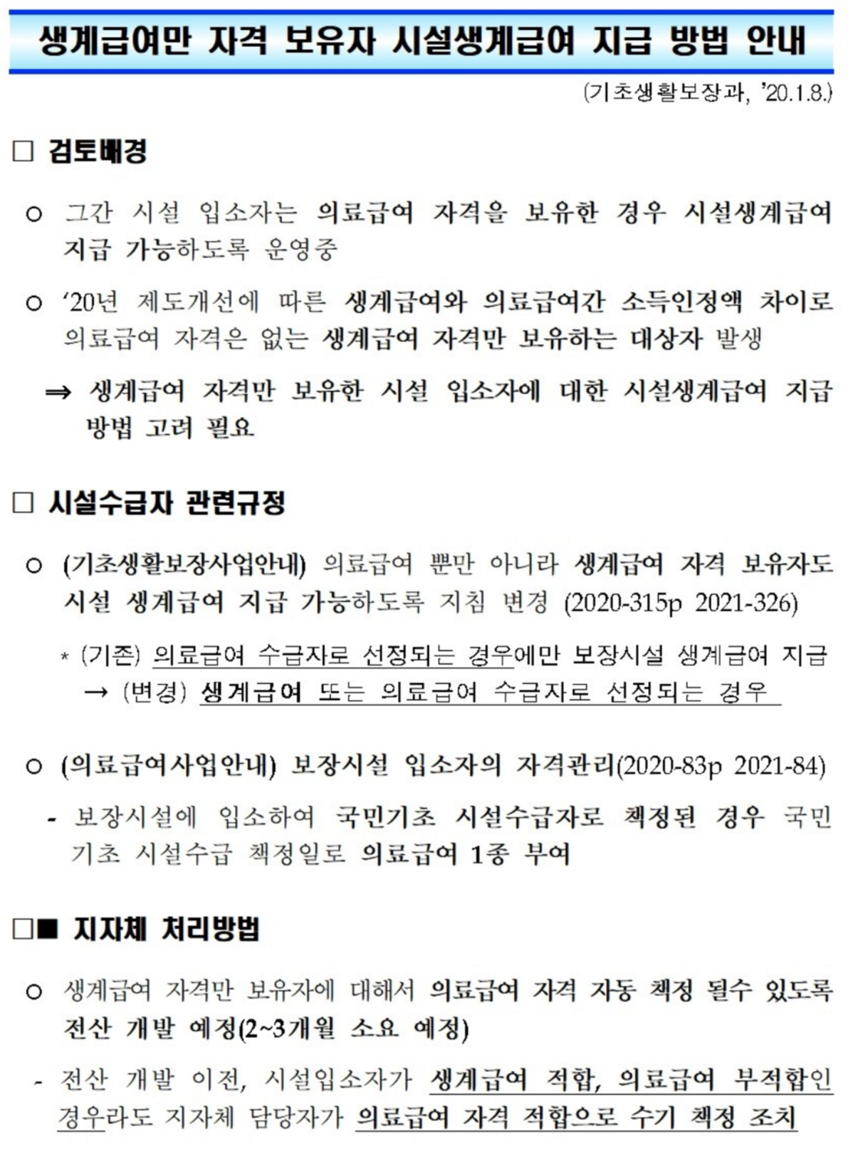 그래서 국가에서는 의료급여가 없는 생계급여 입소자도 의료급여 1종을 부여해 시설 생계급여가 지급 가능하도록 변경되었다.
