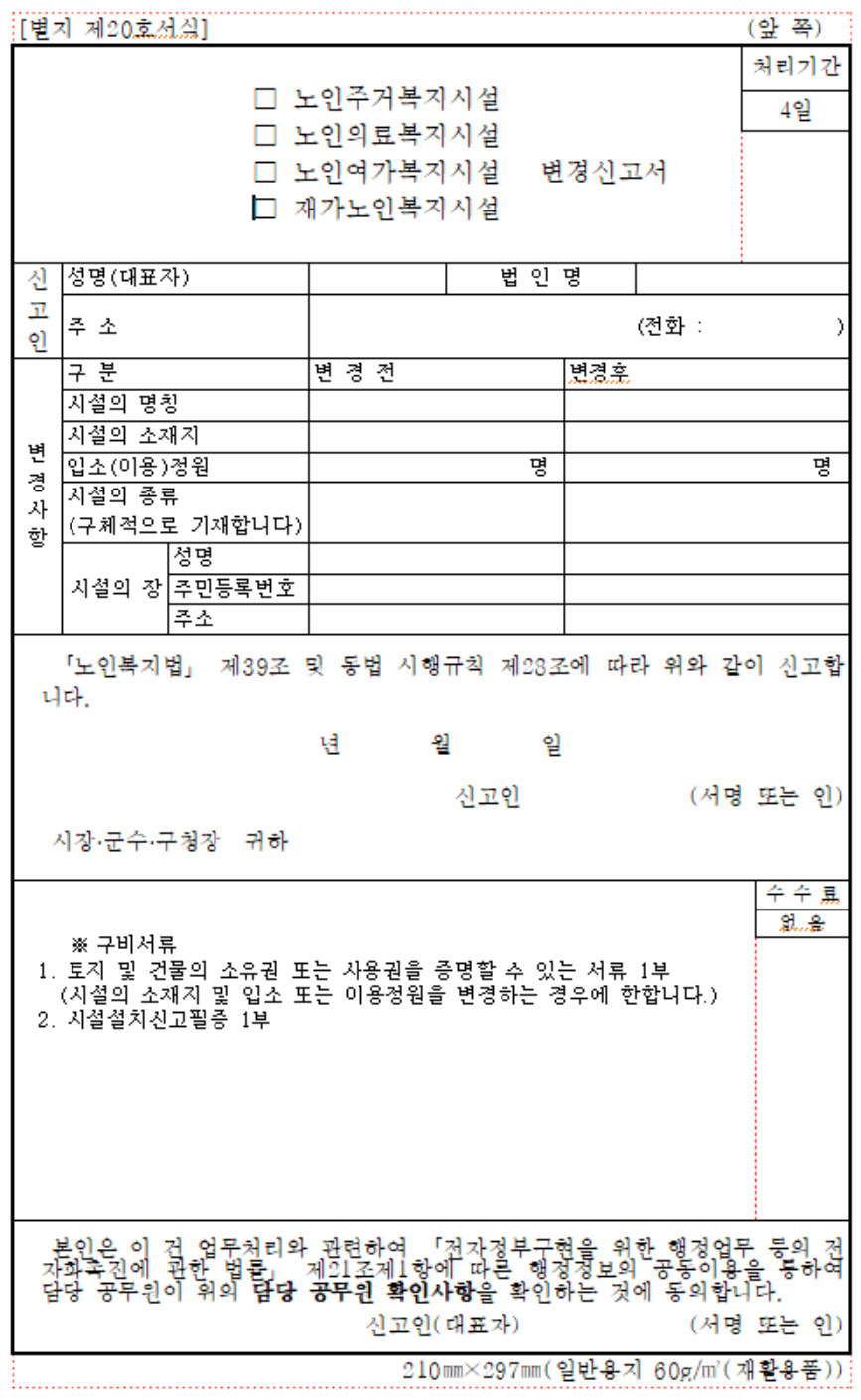 재가복지센터, 요양원 등 장기요양기관이 시설장, 주소, 이용정원 수를 변경할 경우 노인장기요양보험법 시행규칙 별지 제 23호 서식 장기요양기관 변경신고서과 노인복지법 시행규칙 제 20호 서식 재가노인복지시설변경신고서 서류를 관할 구청에 제출해야 한다.
