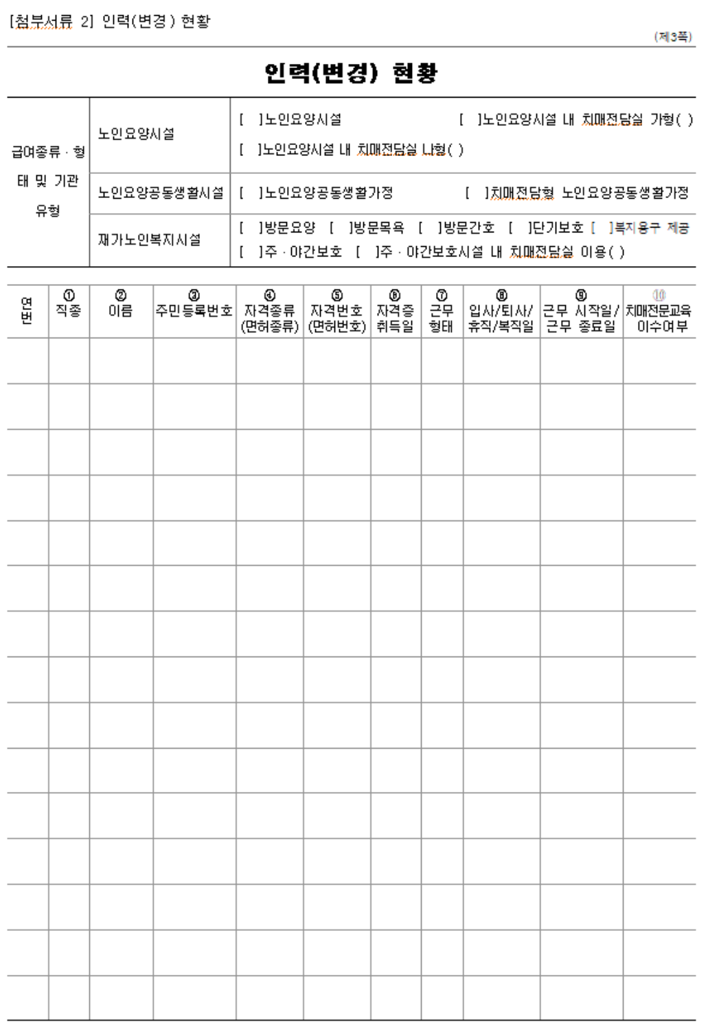시설장을 포함한 요양보호사 16명 이상 명단을 기재한다.