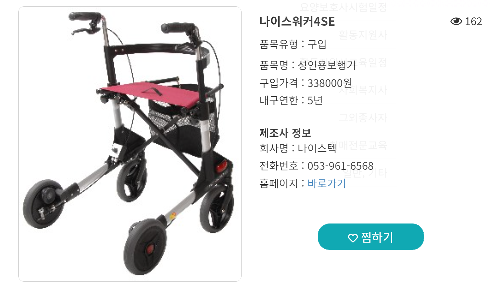 제품 사진 및 구입 가격 ( 대여금액), 내구연한, 제조사 정보를 확인해 볼 수 있다. 구매는 가까운 복지용구 사업소로 문의해 보면 된다.