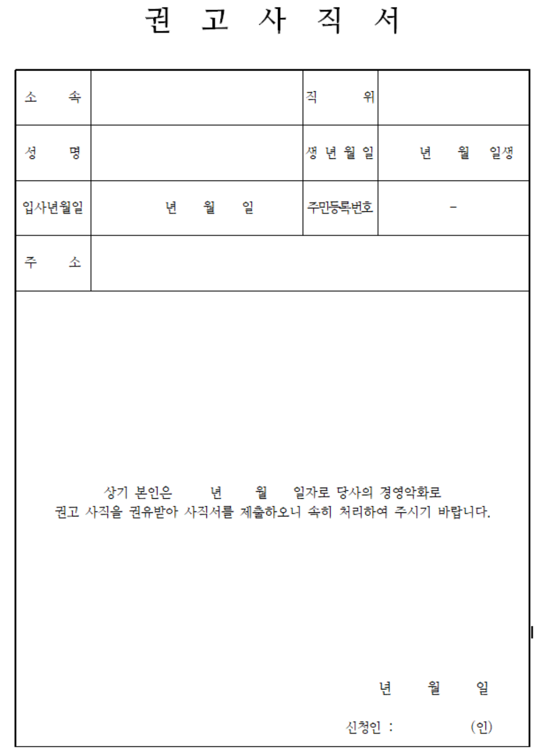 권고사직 또는 해고가 되어야 실업급여를 받을 수 있다. 아래는 권고 사직서 양식이다. 첨부파일은 맨 하단에 있다.