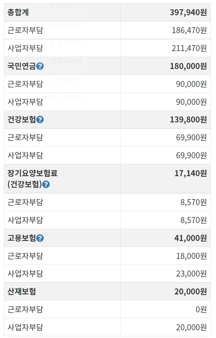 결과값은 4대보험료 합계와 근로자, 사업주가 부담하는 각각의 보험료를 계산해 준다.
