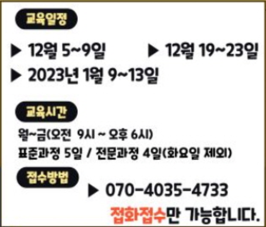 | 신규 주말반 | 22차 | 40 | 2022년 11월 19, 26일 / 12월 3,10,17일 (매주 토요일) (매주 토요일 5회 오전 9시 ~ 오후 6시) |