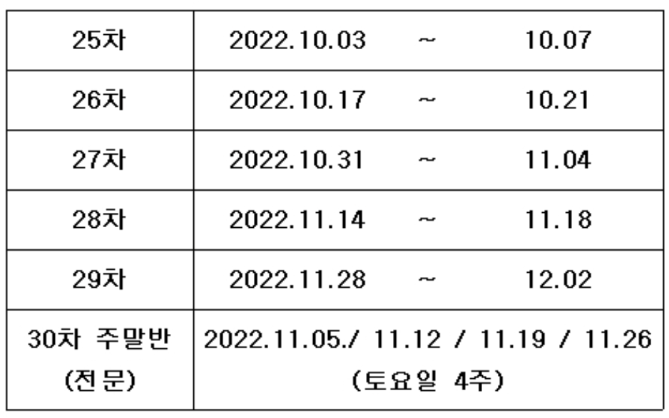| 유사 평일반 | 21차 | 32 | 2022년 11월 21,23,24,25(월,수,목,금) (4일간 오전 9시 ~ 오후 6시) |