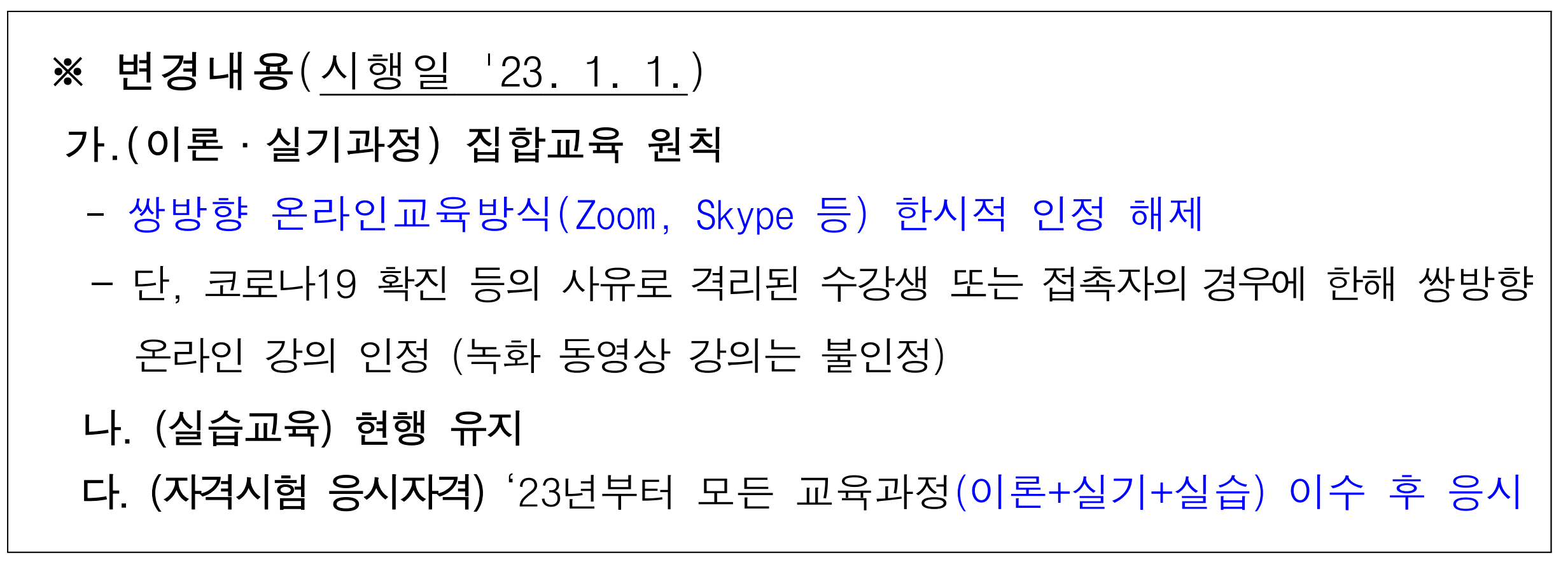 - 쌍방향 온라인교육방식(Zoom, Skype 등) 한시적 인정 해제