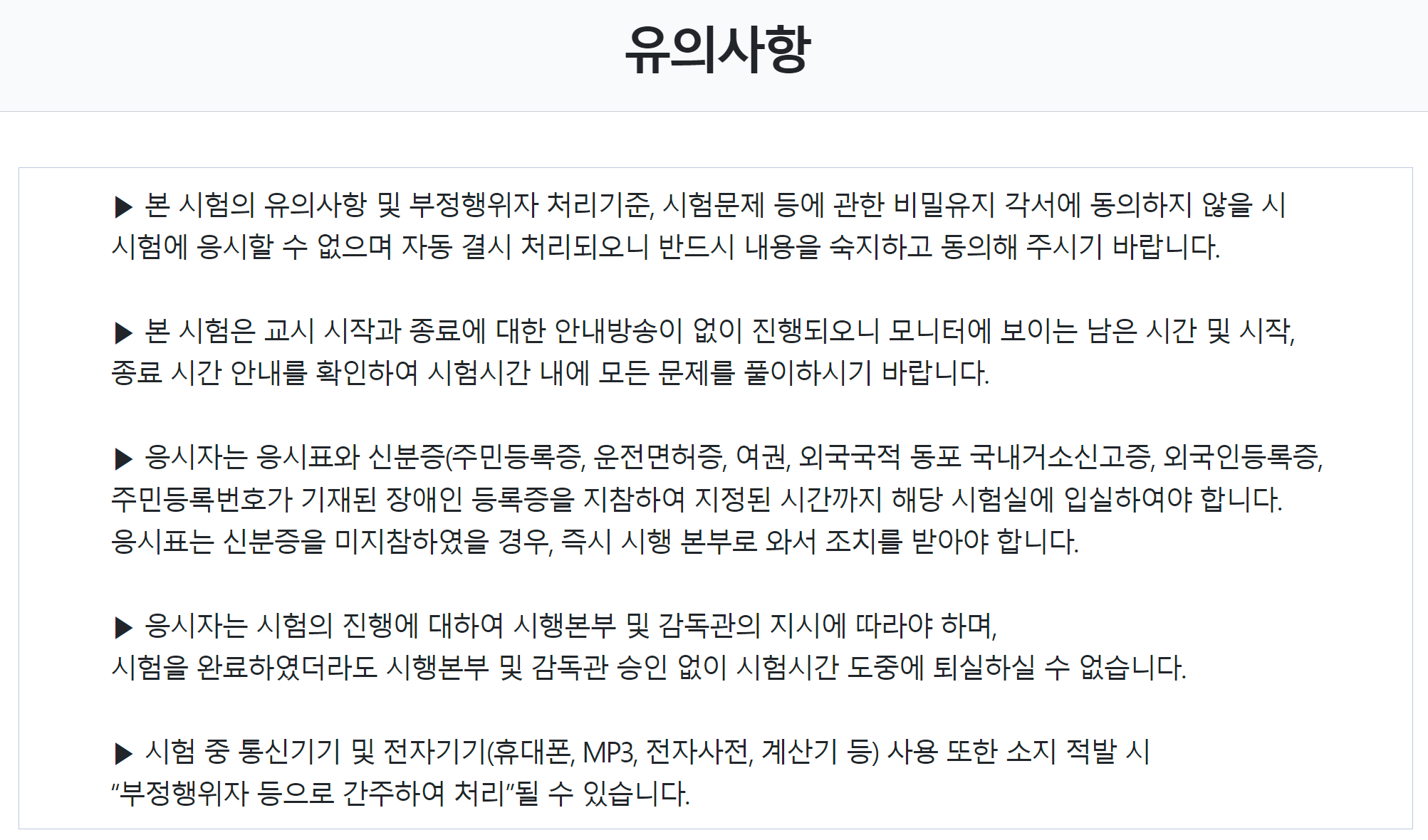 다음으로 시험 응시에 대한 유의사항이 나온다.
