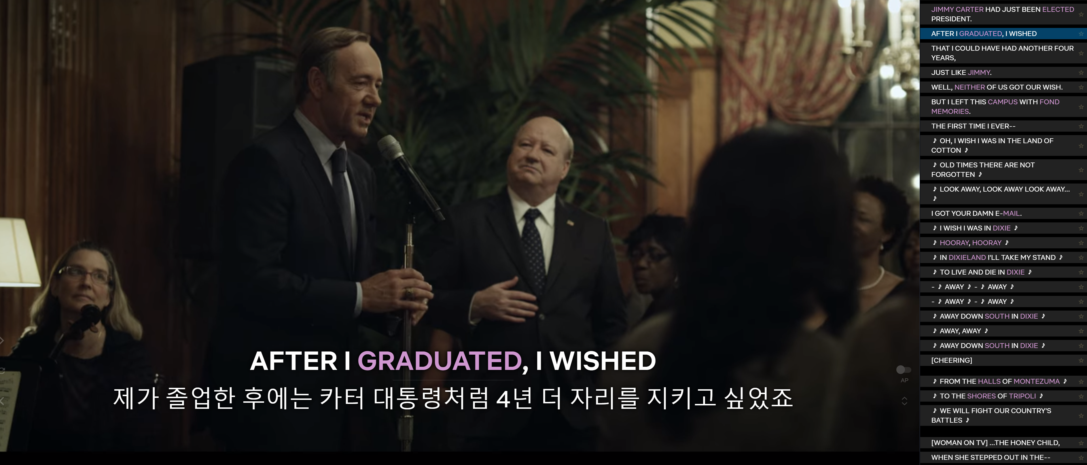 영어와 한글이 동시에 나오고 우측에 스크립트도 보입니다.