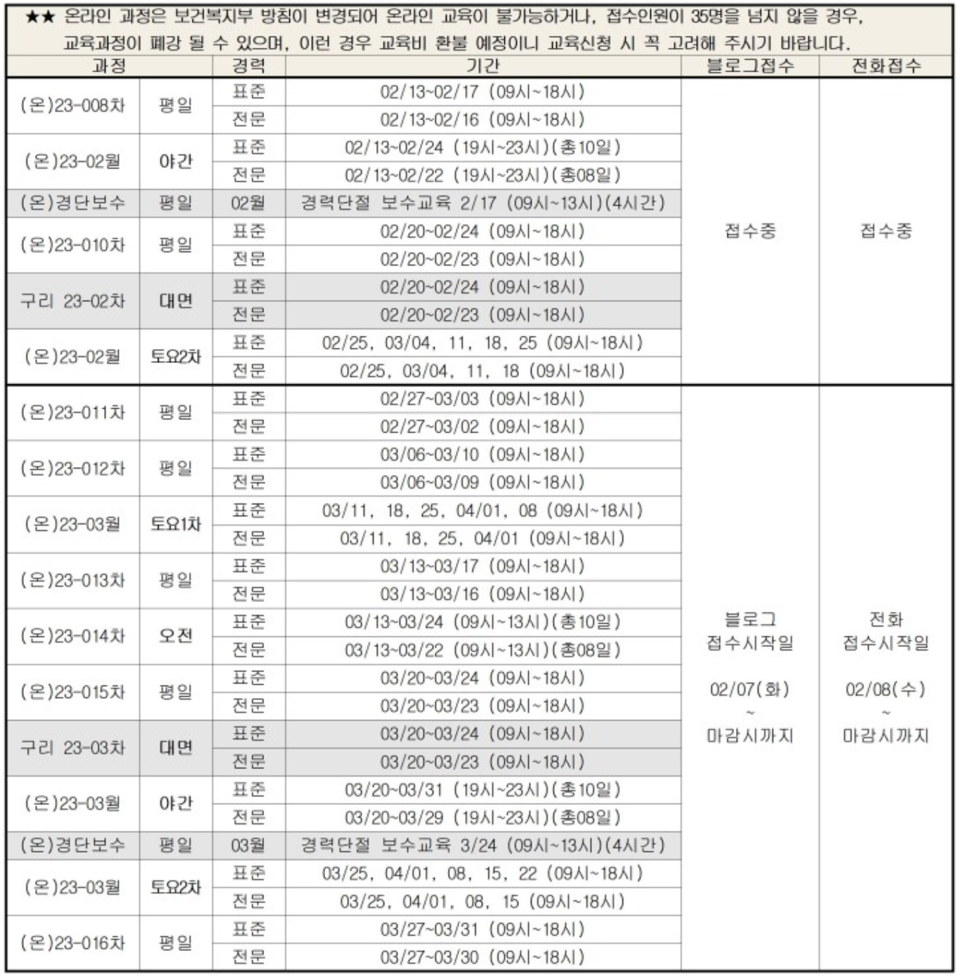 | 2023년 2월 | 회원가입후 접수*온라인 줌 교육(교육장소:복지관) -접수일자: 1/31(화)10:00(선착순 45명/대기 20명(교육취소시 대기자 순) /표준과정(5일):2/13(월)~2/17(금)/전문과정(4일) : 2/13(월)~2/16(목) |