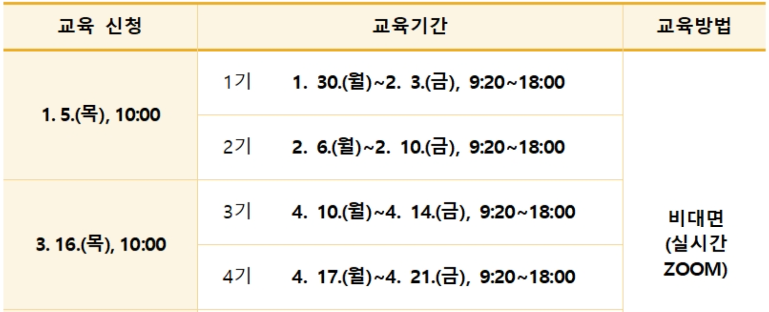 | 4회 | 2023년02월06일(월)~02월10일(금) 총 5일간 | 23년 02월 13일(월)~02월 16일 (목) 총 4일간 |