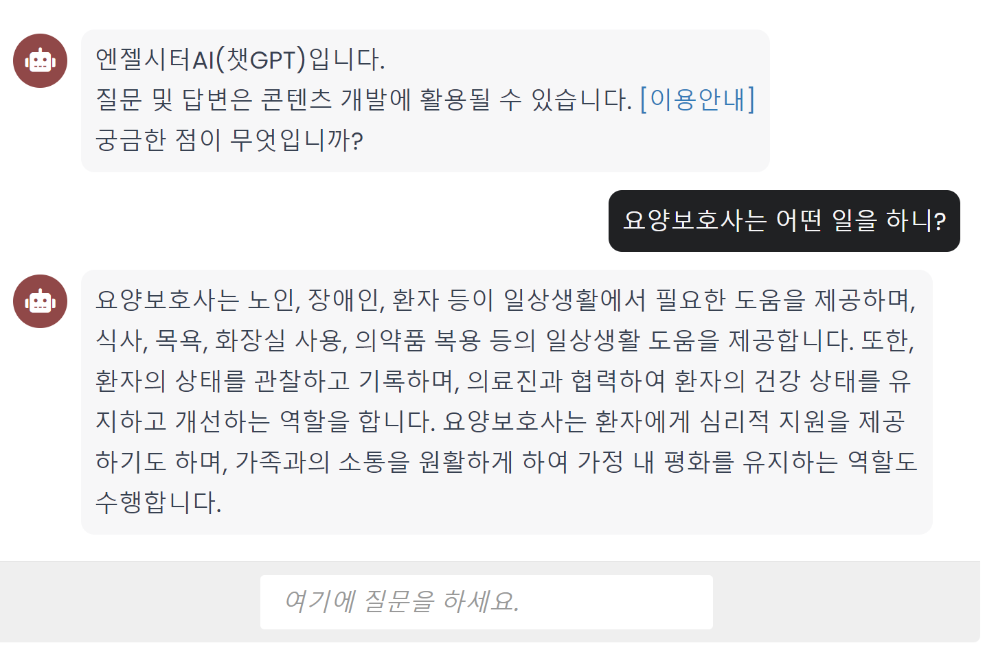 장기요양 및 노인, 장애인 등 취야계층의 복지 엔젤시터에는 챗GPT 기반의 AI 질문을 받는 서비스를 오픈했다.
