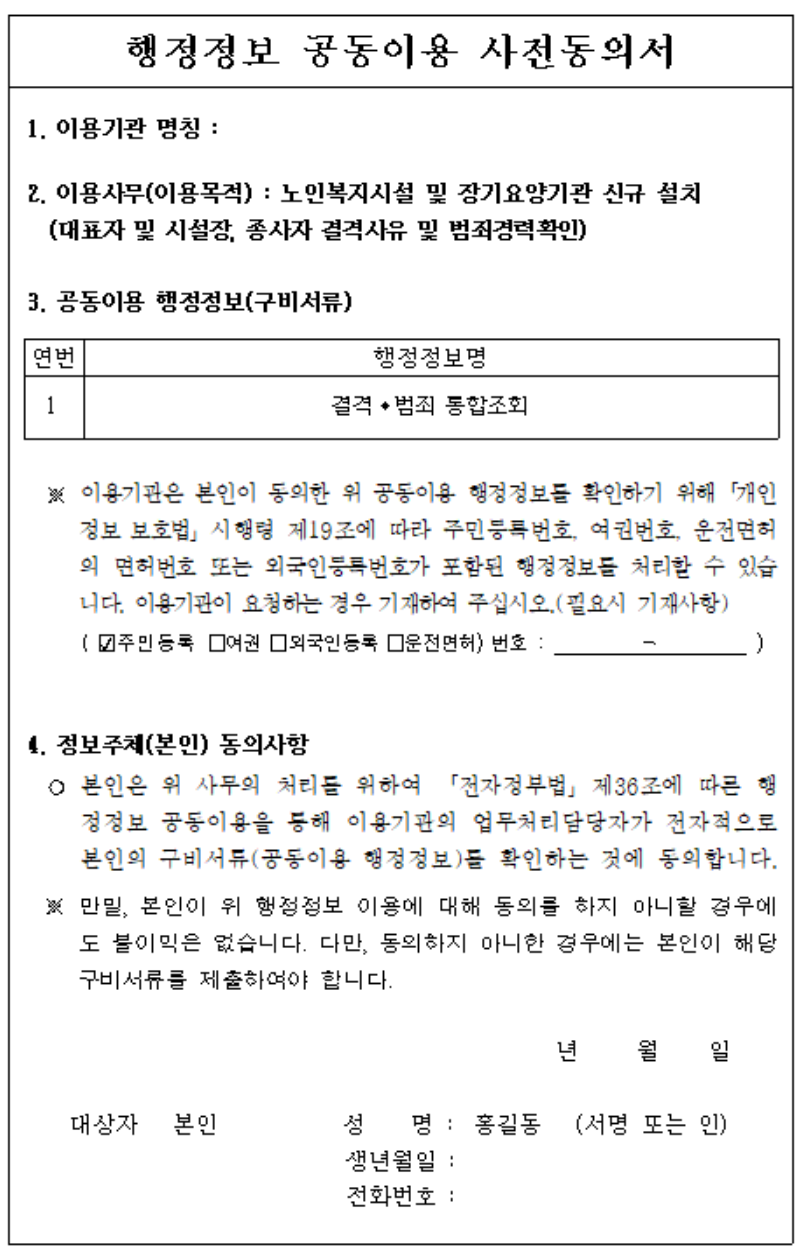 그 동안 범죄경력 및 노인학대범죄경력, 장애인학대범죄경력 조회 동의서를 사용했으나 행정정보 공동이용 사전동의서를 사용해야 한다.
