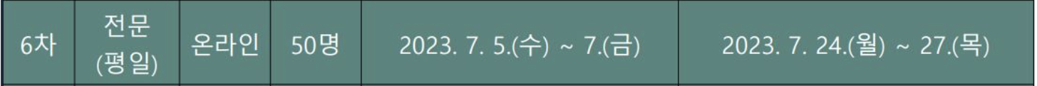 | 16회 | 토요반 7/1 7/8 7/15 7/22 7/29일반교육 총 5일간 | 23년 06월 05일(월)~06월 09일 (금) 총 4일간 |