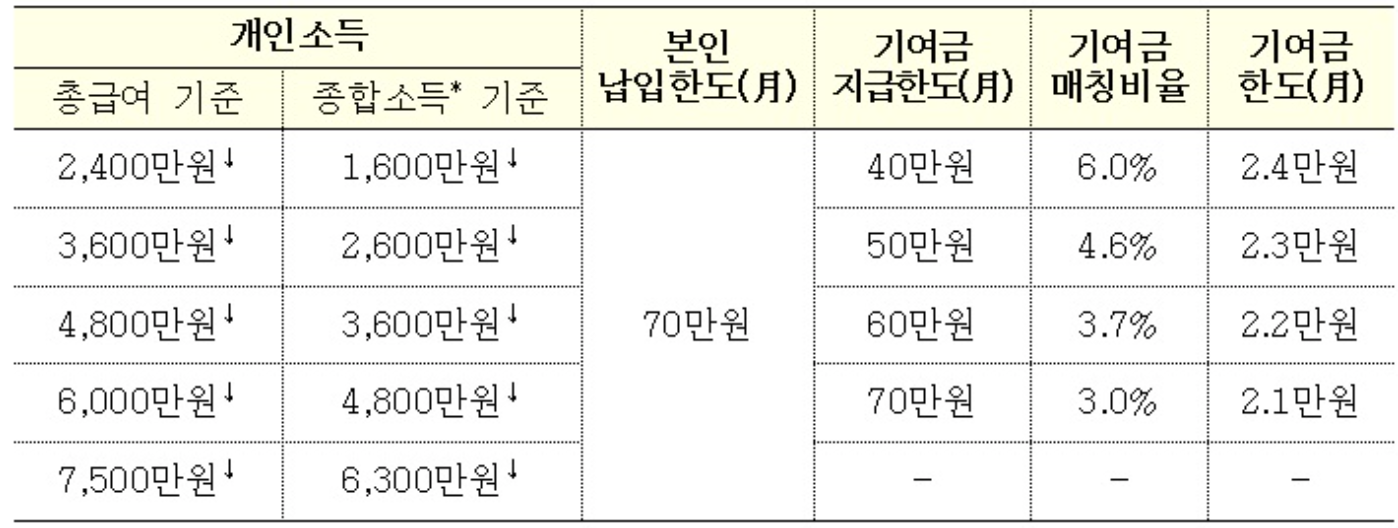 납입금에 따라 정부기여금 매칭 지원과 이자소득세 비과세 혜택을 제공한다.