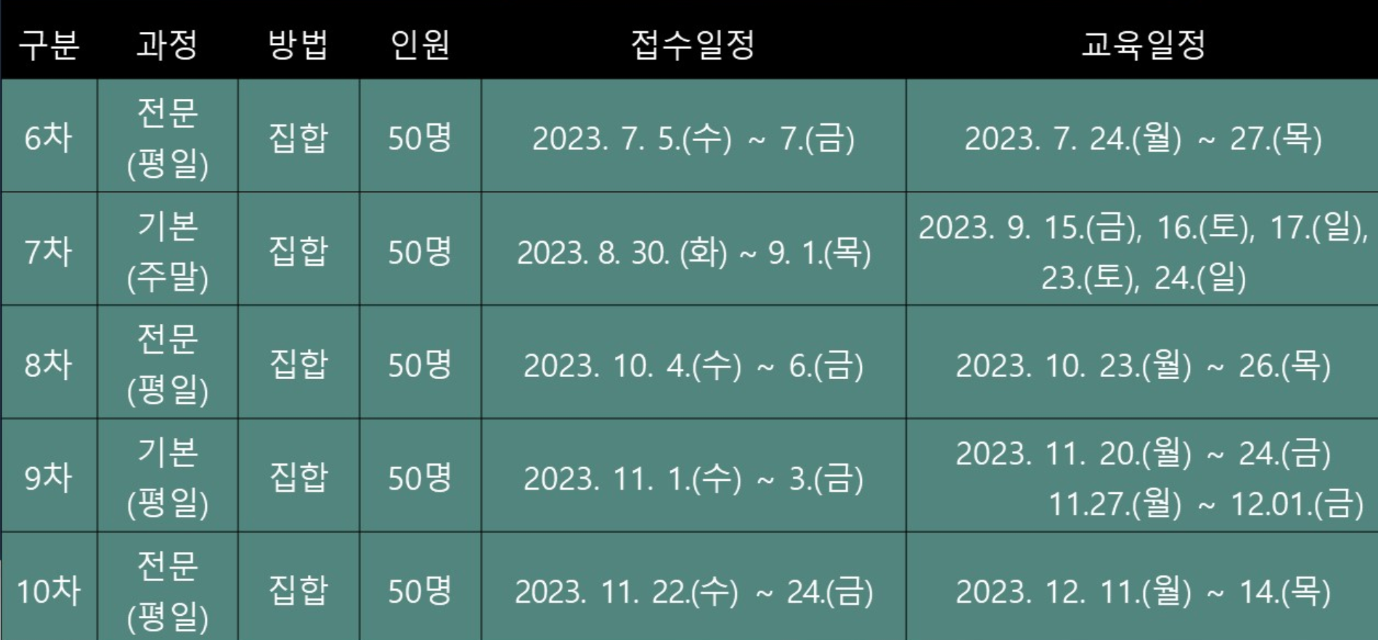 | 23회 | 토요반 10/28 11/4 11/11 11/18 11/25일반교육 총 5일간 | 23년 10월 23일(월)~10월 26일 (목) 총 4일간 |