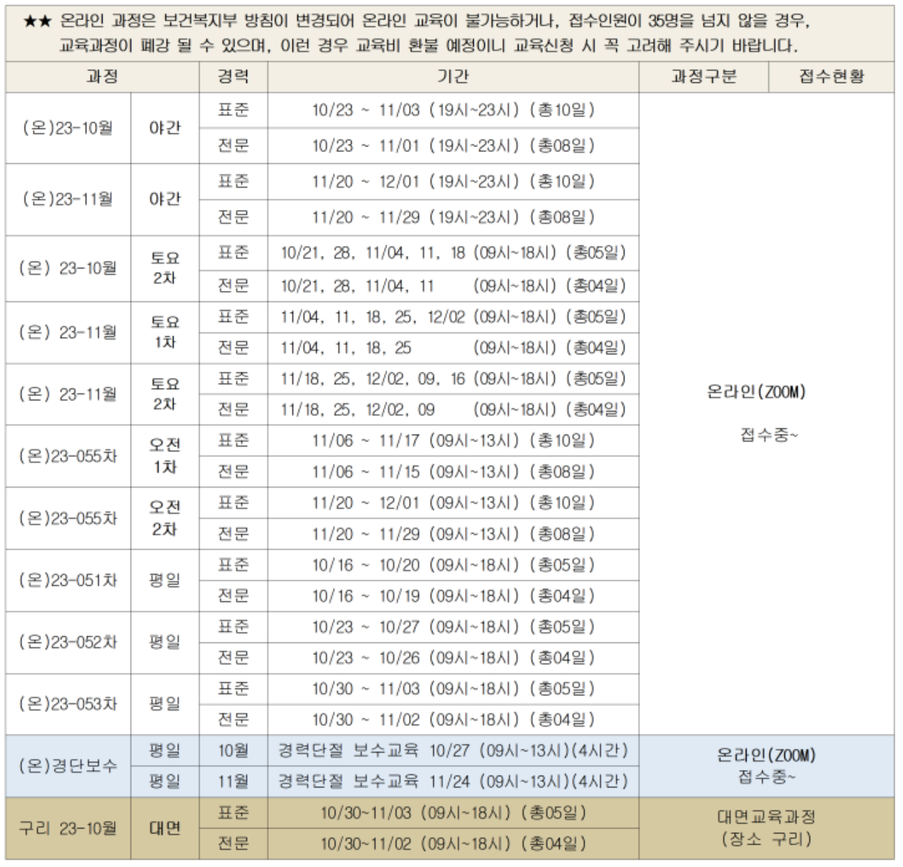 | 2023년 11월(2차-비대면대면동시) | 표준과정:11월13일(월)~17일(금)/전문과정11월13일(월),14일(화),15일(수),17일(금) 접수 : 10.4.(수)09:00~ 선착순으로 마감함 |