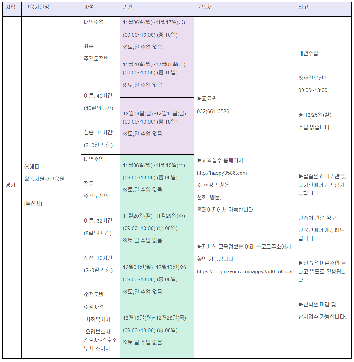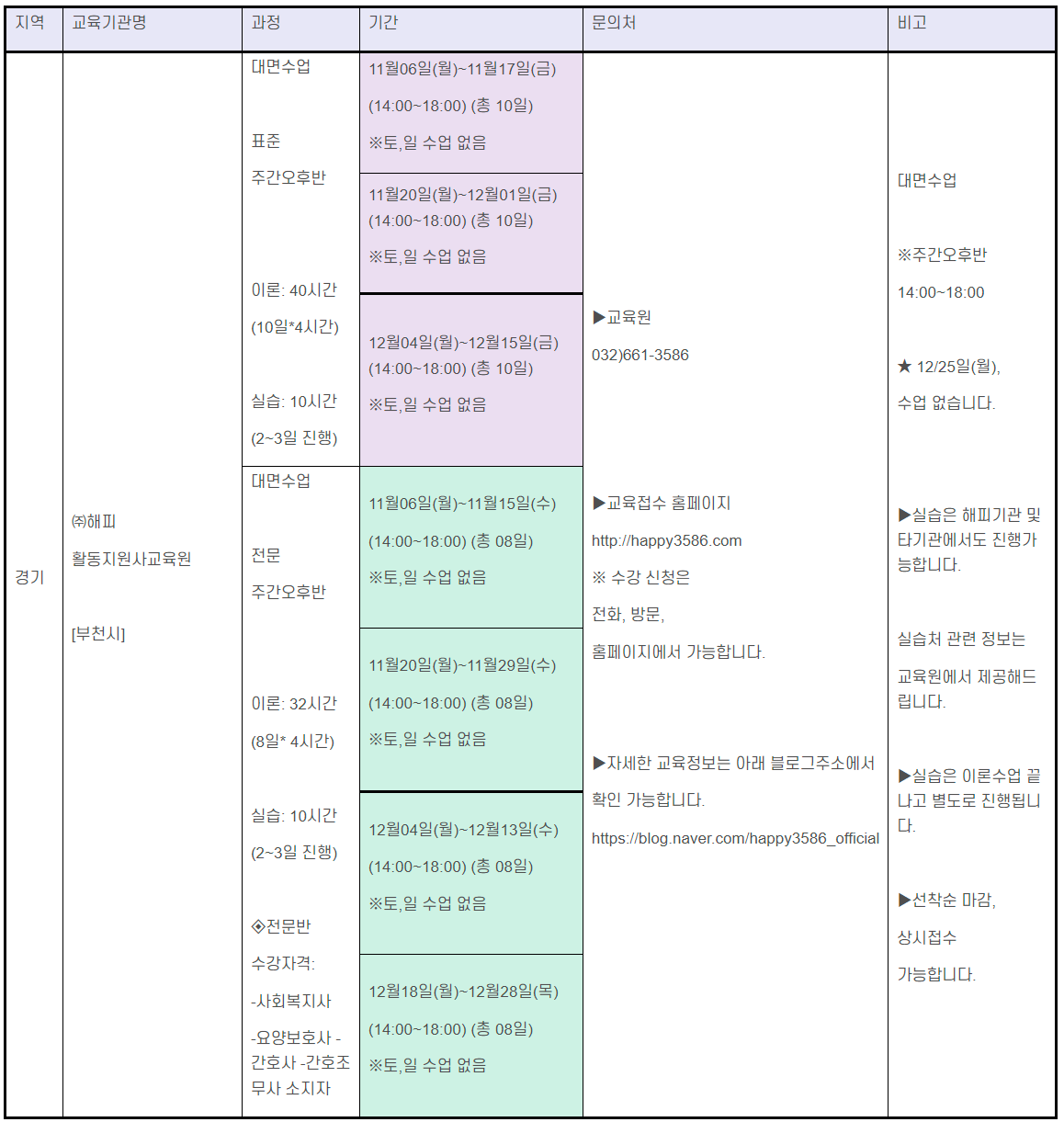 경기도에 소재를 둔 장애인활동지원사 교육기관의 2023년 11월 교육 일정을 정리한 글이다. 교육일정 및 교육 방식은 해당 기관 사정에 따라 변경될 수 있다.