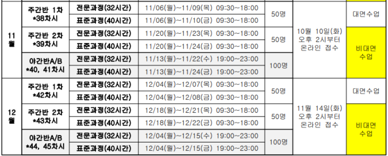 | 2023년 11월(12차주말) | 표준과정:11월11일(토),18일(토),25일(토),12월2일(토),9일(토)/전문과정:11월 11일(토),18일(토),25일(토),12월9일(토) 접수 : 10.4.(수)09:00~ 선착순으로 마감함 |