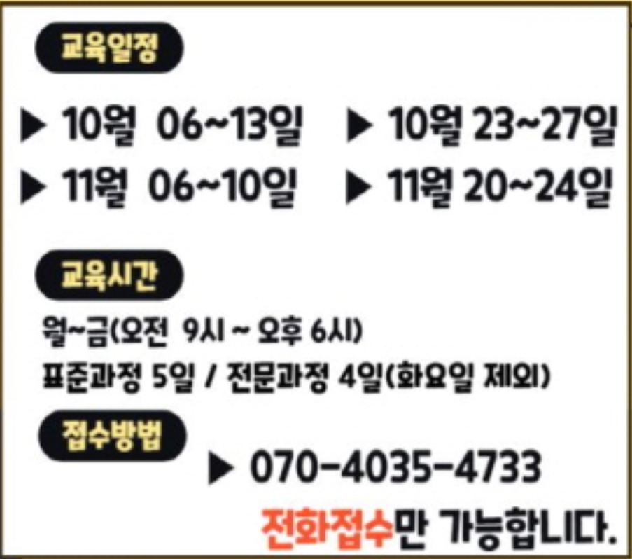 | 신규 평일반 | 13차 | 40 | 2023년 11월 06(월)~ 11월 10(금) (5일간 오전 9시 ~ 오후 6시) |