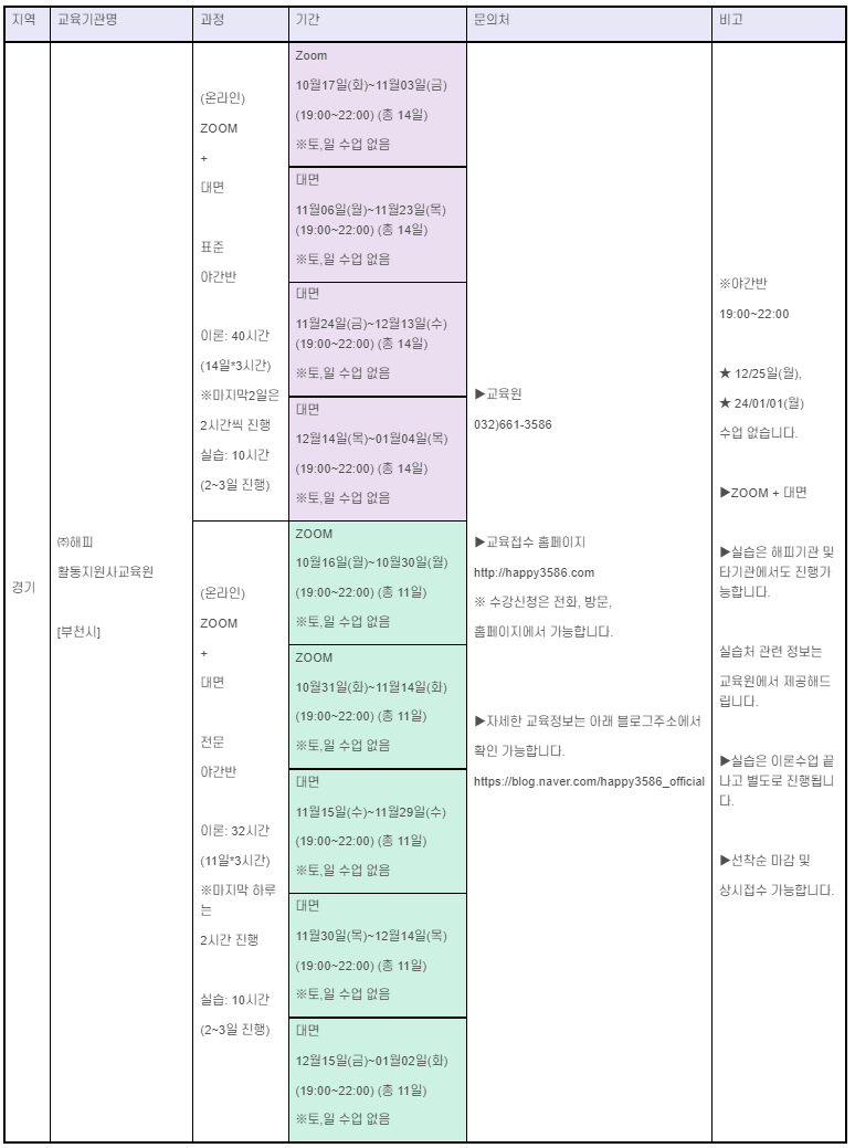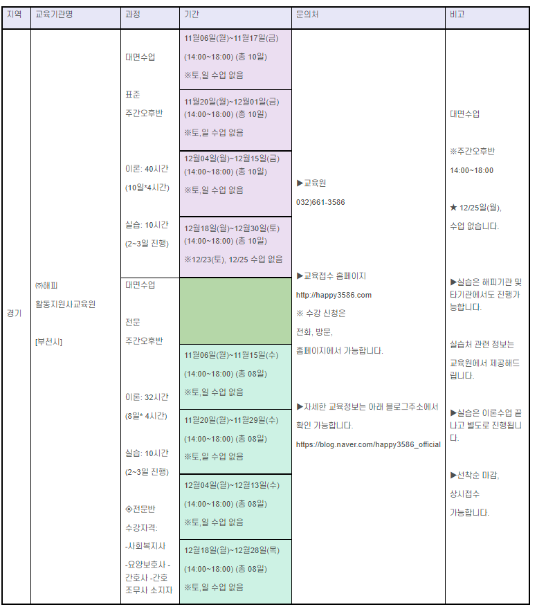 | 장애인활동지원사양성교육 | 2023년 12월(2차대면) | 표준과정:12월18일(월)~22일(금)/전문과정12월18일(월),19일(화),20일(수),22일(금) 접수 : 10.4.(수)09:00~ 선착순으로 마감함 |