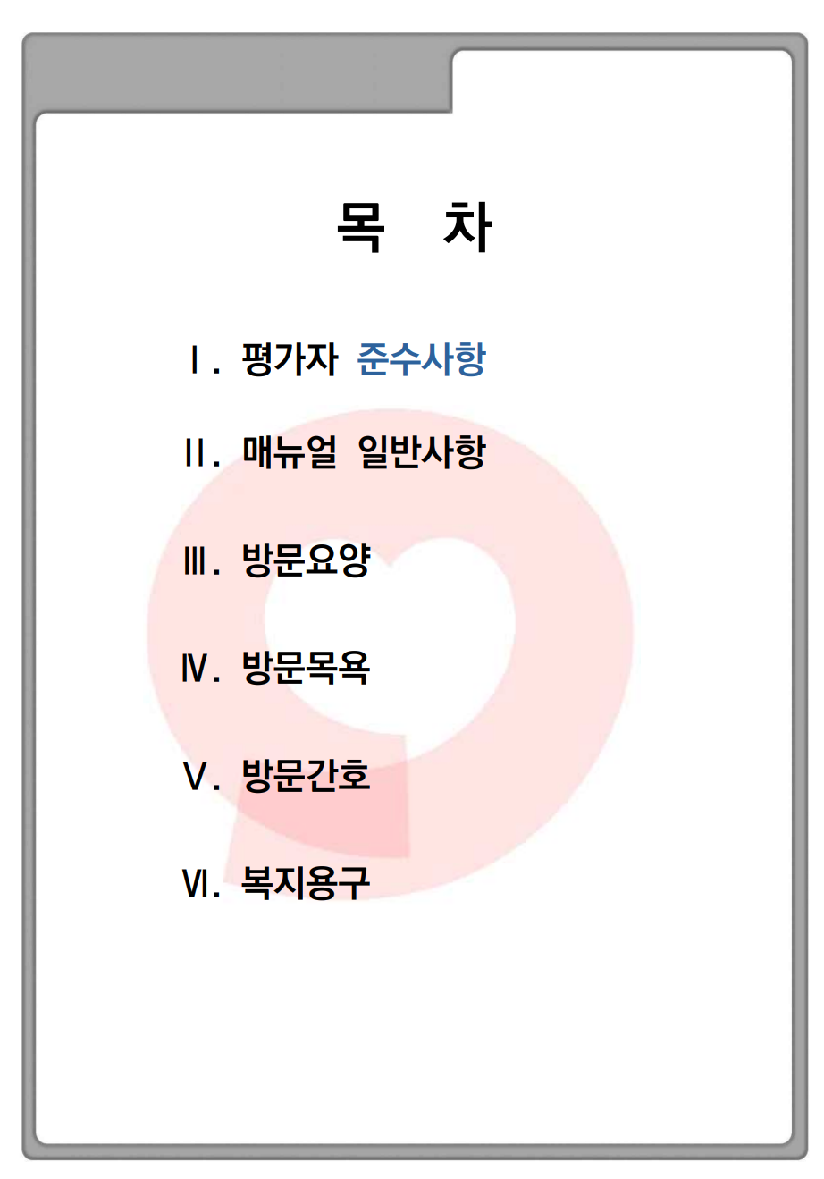 이 자료는 장기요양 재가급여 중 방문요양센터, 방문목욕, 방문간호, 복지용구에 대한 평가매뉴얼이다.