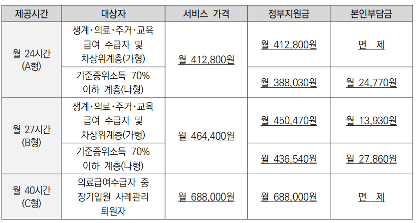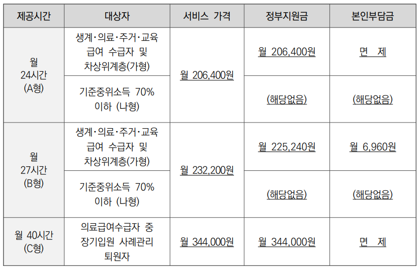 2024년 가사간병방문지원 서비스 대상자 조건 및 본인부담금