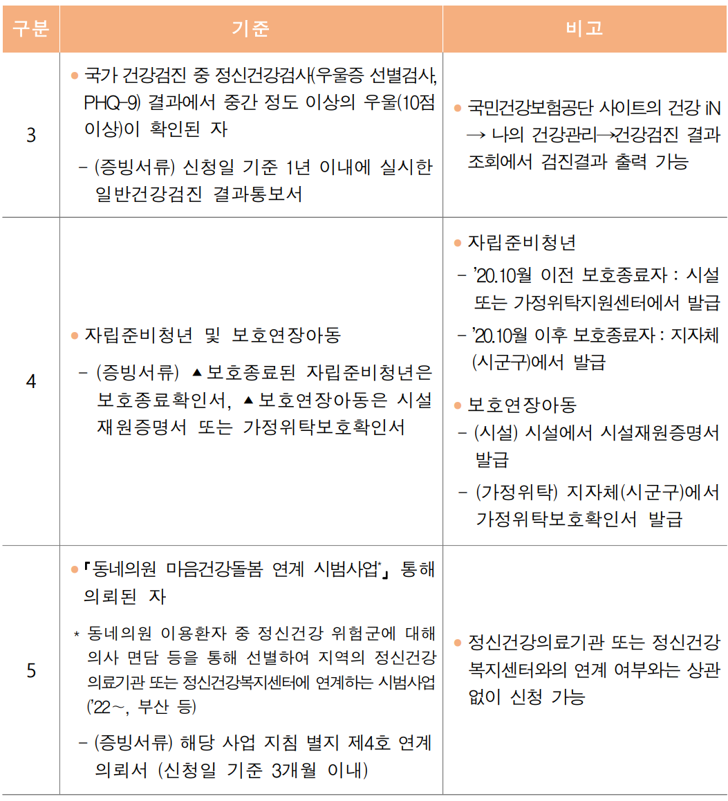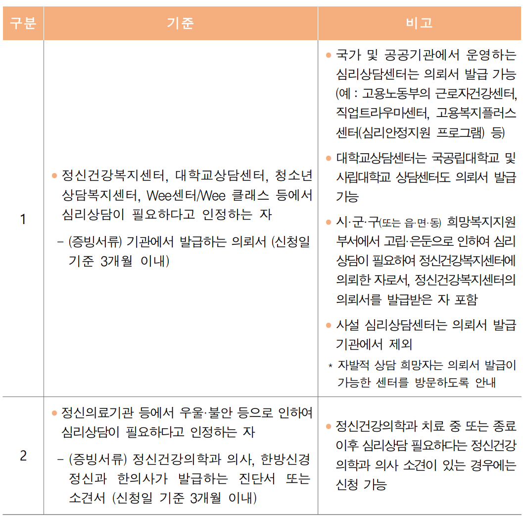 모든 국민이 나이 및 소득과 상관없이 신청할 수 있지만 우울·불안에 대한 사유가 있어야 한다.
