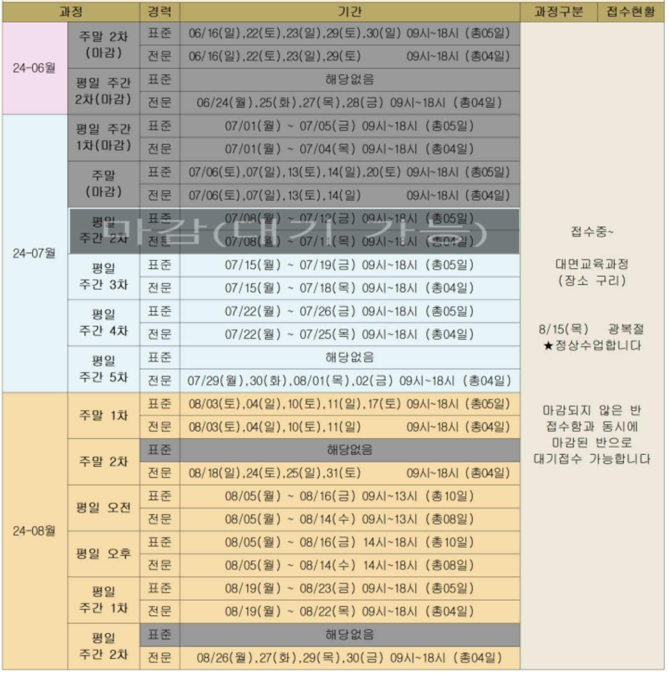 | 8월 | 표준 | 8/05(월)~8/09(금) | 7/23(화) ~ 온라인 접수 |
